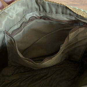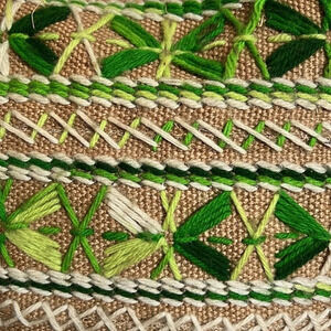 This vintage-style handbag is as fun as it is unique. The beautiful burlap-style fabric is a great complement to the gorgeous green stitched design. It's the perfect size to fit all your summer essentials, and the lined interior has a single pocket for keeping small items organized. The only downside is that the zipper on the pocket doesn't fully zip. This bag would be a great addition to any summer wardrobe.