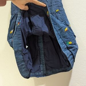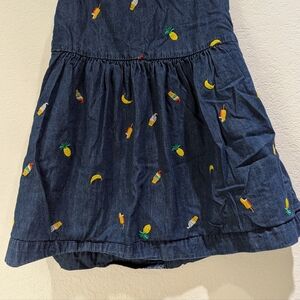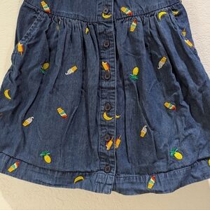 Hanna Andersson 100% cotton Chasing Summer Button Up Chambray denim dress features colorful allover summer treat-themed embroidery of ice cream and pineapples.