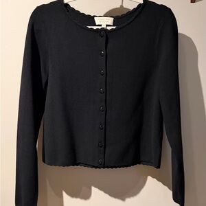 Sezane cardigan in a timeless black knit. Scalloped trim at neckline and cuffs. Button-front closure with small round buttons. Slim, slightly cropped silhouette. Soft, lightweight knit for layering.