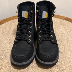 Durable Carhartt lace-up boots with moc toe design. Sturdy soles for reliable traction. Metal eyelets and secure lacing. Padded ankle for added comfort. Rugged style for work or casual wear.