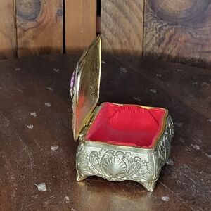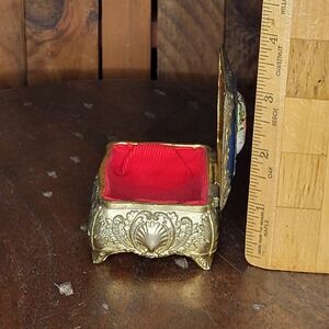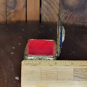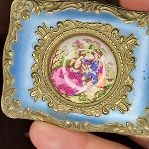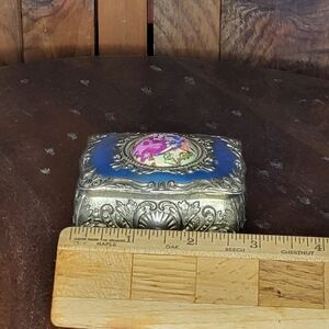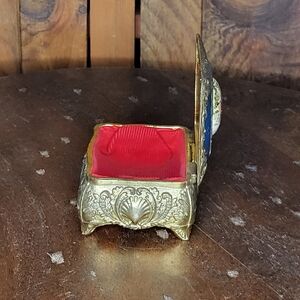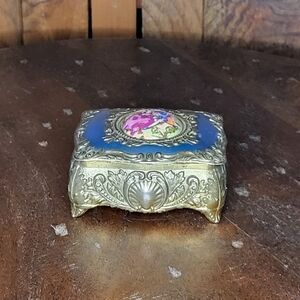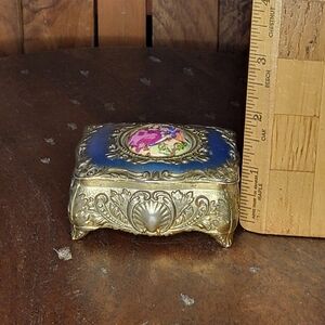 Elegant vintage jewelry box with intricate gold detailing and a vibrant blue top. Perfect for storing small treasures. Excellent Original Condition. $25.