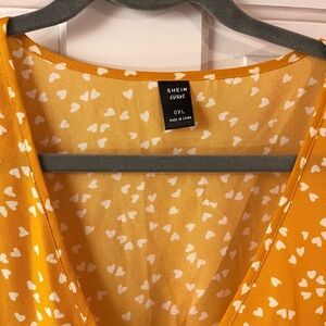 Bright yellow dress with scattered white heart prints. V-neckline and short flutter sleeves. Soft tiered skirt for a flowy look. Feminine and playful style. Fits like an XL.