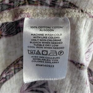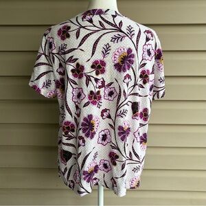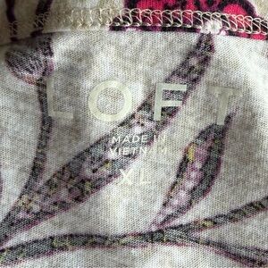 This is a super versatile short sleeve knit top from LOFT, ladies size XL. The fabric, 100% cotton, featuring a soft cream background with a vibrant floral print in shades of pink, purple, and black. The lightweight fabric and relaxed silhouette make it perfect for everyday wear, work, or casual outings.