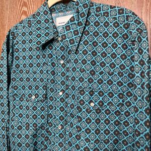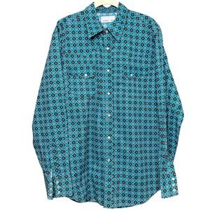 VTG 80s Wrangler Wrancher Western Cowboy Turquoise Pearl Snap Abstract Shirt Lg