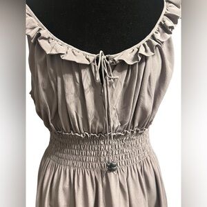 The dress features a ruffled neckline with a tie detail at the front and a shirred elastic waistband. It has a sleeveless design and a relaxed fit through the skirt.
