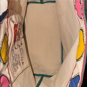 Stylish multicolor heart-print tote with a bold striped bow accent. Bright white background with colorful hearts creates a playful look. Easy top handles in teal for comfortable carrying. Perfect for everyday use and adds a cheerful pop to any outfit. In excellent used condition. Please bid responsibly no cancellations no returns.