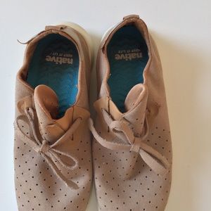 These Native sneakers may just be the most comfortable shoes you’ve ever worn! Great neutral tan color. Moccasin style with lace detail and slip on convenience. Lightweight. Perforated one piece microfiber upper. Rubber toe and heel inserts. EVA midsole and outsole. Super foam insert