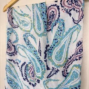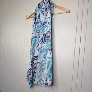 Perfect for cool days. Add some color to your outfit with this lovely scarf. Soft paisley print fabric. White base with blue and yellow accents. Playful and bright pattern. Versatile for casual wear.