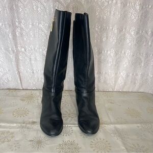 The KATE SPADE SATURDAY leather and suede boots in size 7.5 feature a stylish black color with zipper accents, making them a chic and versatile choice for women. Made with high-quality leather and a comfortable leather insole, these riding boots offer both style and comfort. The brand's reputation for quality and design is evident in these elegant boots that are perfect for any casual or dressy outfit.
