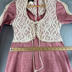 Gunne Sax by Jessica San Francisco maxi dress in a dusty rose pink hue with a linen-like texture. This vintage prairie-style piece features intricate cream crochet lace overlays on the bodice, back, and sleeves, complemented by a lace-up corset-style front. The long sleeves are detailed with lace inserts, and the skirt finishes with a ruffled hemline accented by matching lace trim. A high neckline and back zipper closure complete this romantic, bohemian aesthetic.