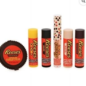 A must-have for Reese’s fans! This NIB 6-piece scented candy lip set includes 4 flavored lip balms, 1 gloss tube, and a molded peanut butter cup lip gloss. Features fun flavors inspired by Reese’s and Reese’s Pieces.