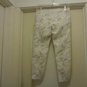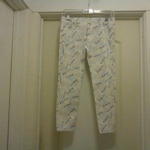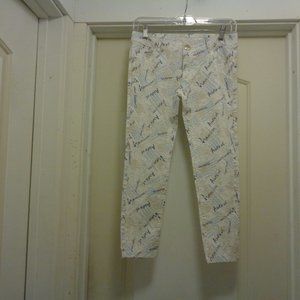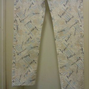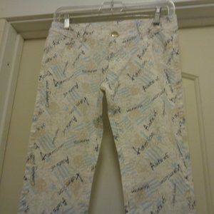 THESE PANTS ARE DARLING. THEY SAY ALOTS OF AMERICAN GOOD LUCK AND HEAVEN. ALL THE WAY AROUND THE LOW WAIST IS 30 INCHES. FROM METAL BUTTON DOWN TO THE CROCH IS 9 INCHES. THEY SEEM TO BY COTTON. THERE ARE NOT TAGS EXCEPT M. ON THE METAL BUTTON IT SAYS JEANS. WITH SOME WEAR YET PLENTY TO SHARE WITH YOU LUCK BUYER.. ENJOY FUN THINGS. 2ND GROUP. THANKS