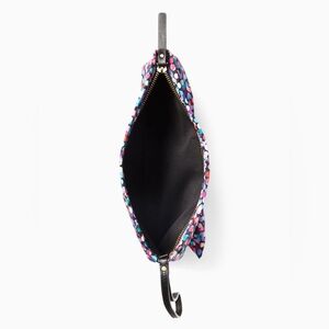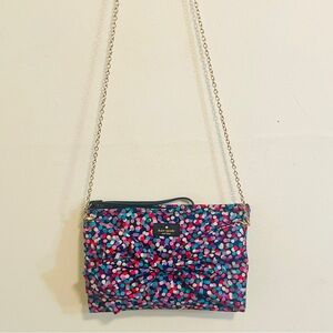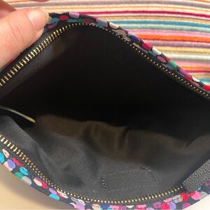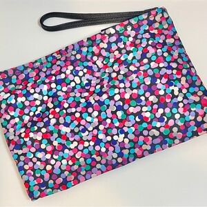 • Design: A bright, festive confetti print finished with a matching front bow. It includes a top zipper closure and a leather wristlet strap.