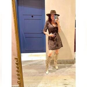 Crafted in a rich chocolate-brown denim, this piece features contrast stitching and delicate embroidered detailing that adds a subtle Western-boho touch. The flattering V-neckline, button-front design, and adjustable waist tie create a beautifully defined silhouette that’s both feminine and effortlessly cool.