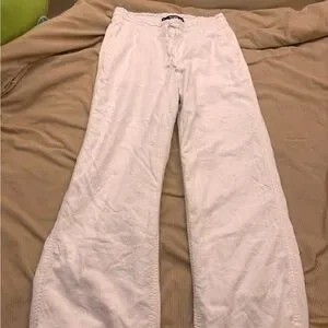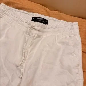 White Hollister wide-leg lined linen pants with a drawstring waist. Relaxed, flowy silhouette. Subtle seam details down the legs. Easy everyday style.