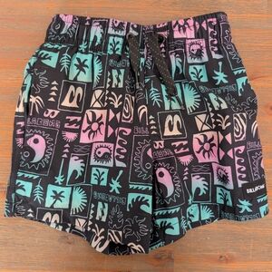 New without tag. Billabong swim shorts with elastic waist and drawstring. Teal inner lining and pink accents. Graphic patterned outer shell in black. Lightweight and ready for the water.