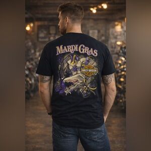 (male model not included )Like new Short-sleeve Harley-Davidson tee with bold Bourbon Street front print. Mardi Gras back graphic features a detailed masked alligator design. Classic crew neck and casual fit. Striking purple and gold lettering and accents.