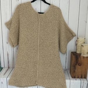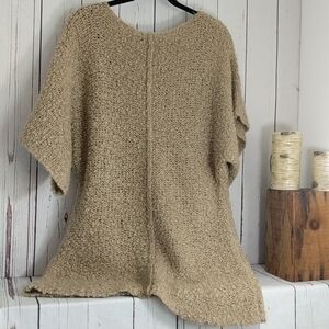 Super soft, oversized just enough to offer a romantic, relaxed fit. Women's sweater with a sweetly scooped neckline. Draped kimono style shorter fit sleeves. Boucle fabric, offers a bouncy, soft texture, similar to a fuzzy teddy bear. Wool and mohair blend will keep you cozy and warm. A thick vertical seam detailing is mirrored from the front to the back. Easy neutral color; ideal to pair with jeans, black, or a pop of color. Longer length, hits around high thigh.