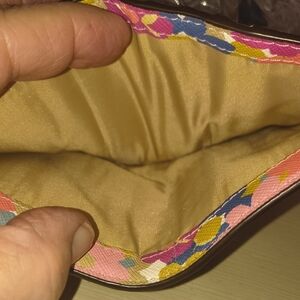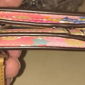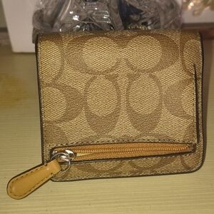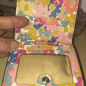 Coach wallet with iconic pattern. Features a classic signature C and wild flower inside. Card slots, clear window and cash slip
