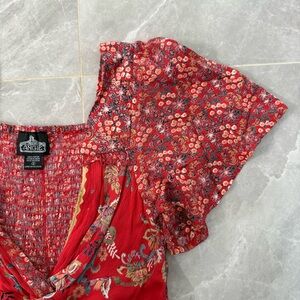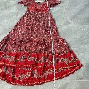 Good condition - Women’s Angie Floral Maxi Flowy Slit Dress Boho Smocked Hippie Cottage. Has twist and keyhole design in front, slit in the front, and smocked back. Colors: red, white, gold, pink, green, black, and orange. Size: S.