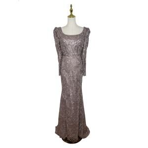 Elegant Mac Duggal gown featuring intricate embroidered scroll detailing throughout the entire dress and a flattering fitted mermaid silhouette. The structured bodice with wide straps and long sleeves creates a refined, sophisticated look, while the dramatic flared hem adds movement and elegance.