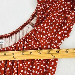 Peasant-style mini dress features an all-over ditsy floral print in white against a warm rust red background. Designed with a elasticized scoop neckline that can be worn on or off the shoulder, it includes short puff sleeves and a tiered skirt for a playful, flowy silhouette. The empire waist is elasticized to provide a comfortable, flattering fit, while the lightweight stretch fabric ensures all-day ease. Perfect for casual outings, picnics, or a cottagecore-inspired look. Excellent pre-owned condition...no stains or holes