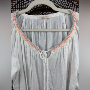 Effortless Lovestitch boho peasant top featuring lightweight textured gauze fabric and colorful embroidered trim along the neckline. Designed with a relaxed silhouette, tie neckline with tassel accents, and flowy sleeves for a comfortable festival-inspired look.