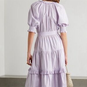 The Dasha Dress is cut from cotton poplin. Thistle is a lavender shade. Designed in a midi-length silhouette, with an elastic waist, removable sash, and voluminous puff sleeves that enhance the feminine feel. Expertly pleated ruffle trim adorns each tier for added flair. - Color: Thistle - Puff sleeves - 100% cotton - Removable waist tie Pockets on side