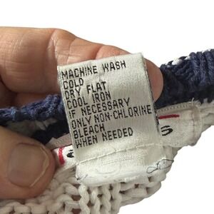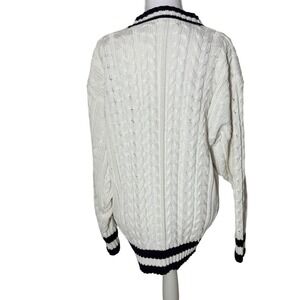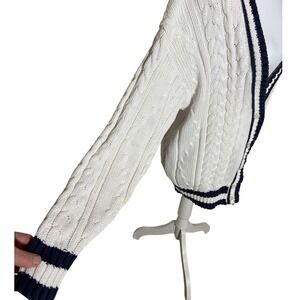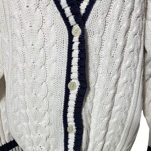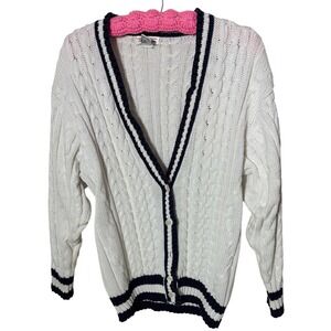 Classic cable knit cardigan features a timeless cricket sweater aesthetic with navy blue and white striped trim. Crafted from breathable 100% cotton, this button-front layer offers a relaxed fit and traditional V-neckline. The chunky knit texture and collegiate-inspired detailing make it a versatile piece for nautical or preppy styling. Please note a small faint yellow spot on the lower sleeve as shown in the detail photos.