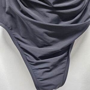 Stylish black one-piece swimsuit with ruched detailing. Perfect for a chic beach look.