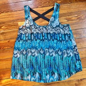 Chic tank top with a vibrant blue and black pattern. Features a stylish elastic criss-cross back design. Fabric is flowy and sheer.