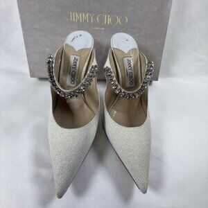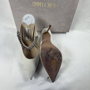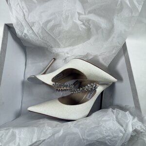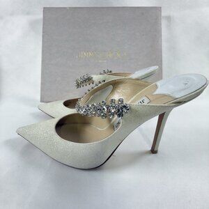 The Jimmy Choo Bing 100 Satin Pump is a stylish and elegant women's heel in ivory color, featuring a stiletto heel and pump style. Made in Italy, this ultra high heel is crafted from satin material, offering a luxurious feel and look. With a medium shoe width and a US shoe size of 38 1/2, this pump is designed for comfort and sophistication, perfect for special occasions or adding a touch of glamour to a classic outfit. The iconic Jimmy Choo brand ensures both quality and fashion-forward style.