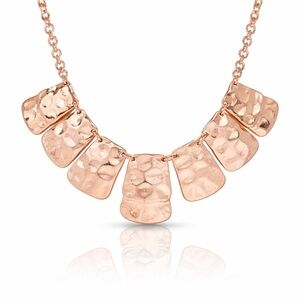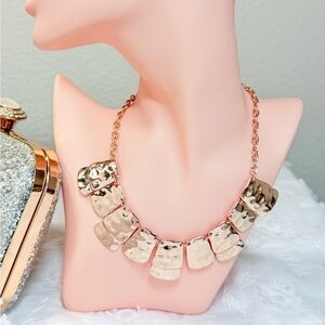This stunning rose gold necklace features a unique hammered design, perfect for adding a touch of elegance to any outfit.