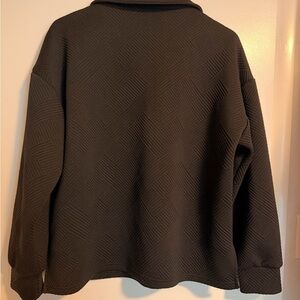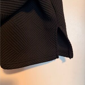 Women’s TWO piece set, black, size L. Stylish black textured pullover with a unique pattern. Features a classic collar and long sleeves with cuffs. Pants have elastic waist and drawstring with same texture as top. Slightly wide leg. Excellent condition!