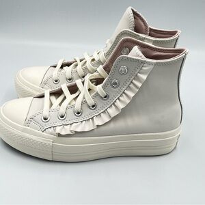 The product is a vintage white Converse Chuck Taylor All Star Hi-Top Leather Platform shoe for women in a US shoe size 6. This sneaker features a ruffled design, leather upper material, and belongs to the Converse Chuck Taylor All Star Leather product line. Ideal for adding a stylish and unique touch to any outfit, this shoe combines classic Converse style with modern accents for a trendy look. Main photo shows the true color more accurately. New, no box