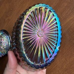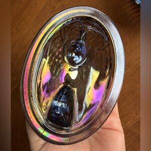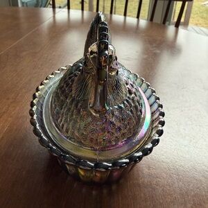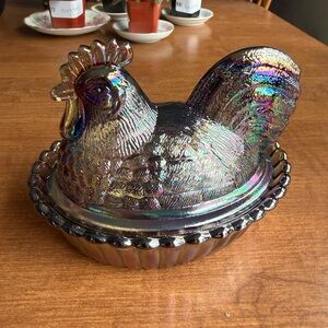 5 inch Rosso rooster on nest. Titanium carnival. Westmoreland mold which is why you see both makers marks on it. Not Vintage. No chips or cracks. I do have the matching Hen in my closet too!