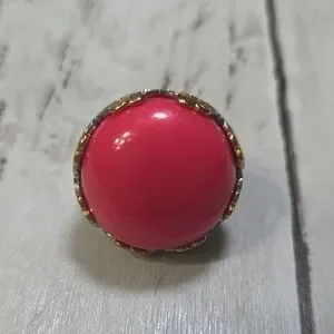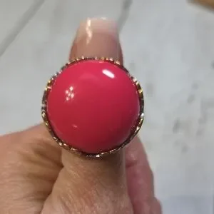 Vibrant pink stone with gold accents on a silver band. Adds charm to any look.