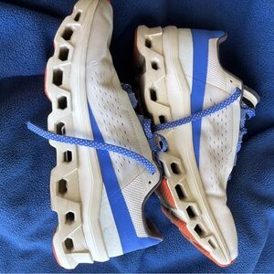 Lightweight On running shoes in white with blue accents. Cushioned Cloudtec sole provides responsive support and smooth transitions. Breathable upper keeps feet cool during runs and workouts. Secure lace-up fit for stability and comfort.