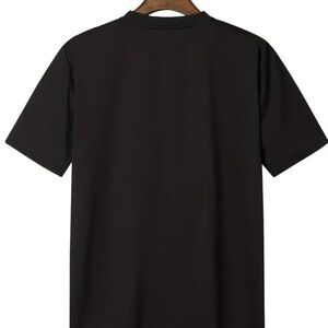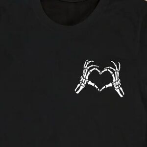 Black tee with a white skeleton hand heart design. Perfect for casual wear. Plain back.