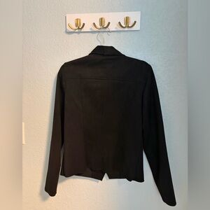 Tailored black blazer with an angled zip front. Lightweight draped collar for a modern look. Easy to layer for work or weekend. Clean, minimal silhouette that pairs with trousers or denim.