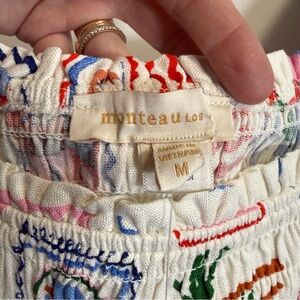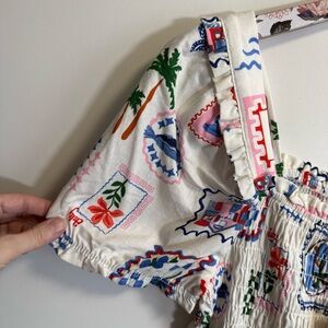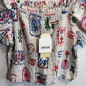 NEW Monteau Los Angeles linen blend crop top featuring a white base with a colorful Italy-themed postcard print and smocked detailing. New with tags. Size medium.