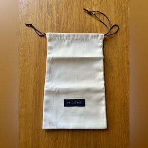 Soft cream fabric drawstring pouch. Navy rectangular brand label reads "M.GEMI". Slim navy drawcords for secure closure. Ideal for storing shoes or small accessories.
