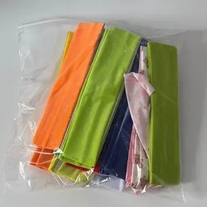 Set of vibrant fabric headbands. Includes pink, blue, yellow, green, and orange colors. Perfect for adding a pop of color to any outfit.