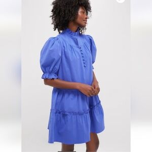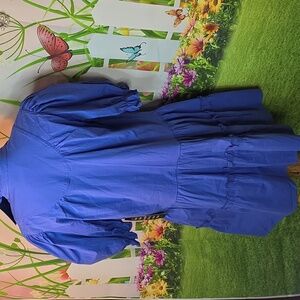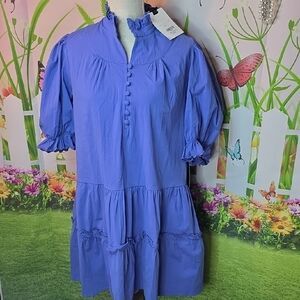 New with tags this beautiful blue/purple Selena mini dress. Has lovely high ruffle neck, tiered bottom and larger puff style sleeves.