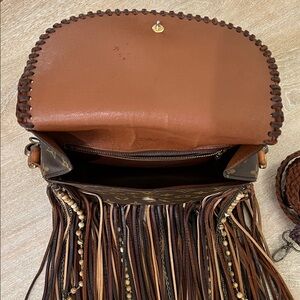 Stylish brown fringe handbag with a unique design. Comes with short and long strap. Stone accent.