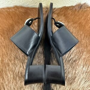 Black leather thong heeled sandals for women. Elegant single band across the foot with a silver-tone embellishment. Stacked block heel provides a comfortable lift. Perfect for a casual daytime outing or a chic evening event.