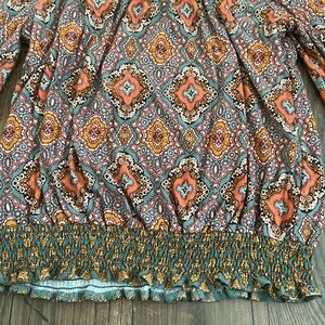Democracy boho style crop top with a colorful geometric paisley inspired print in teal, rust, coral, and mustard tones.