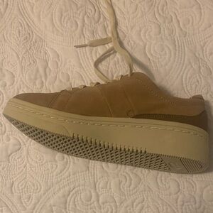 Casual low-top platform sneakers by Dr. Scholl's. Soft tan suede-like upper. Cream laces and cushioned insole. Rubber platform sole for everyday wear.