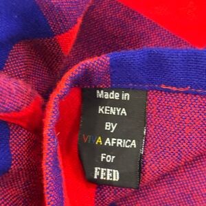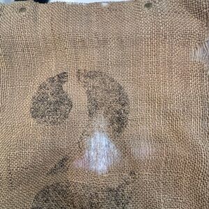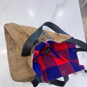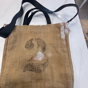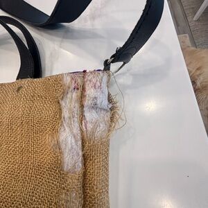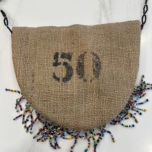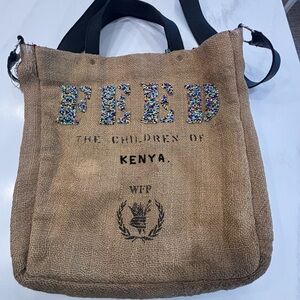 FEED Kenya natural jute tote with multicolor beaded logo. This has DAMAGE!! Check pics Durable jute construction with black strap accents. Includes matching jute pouch with FEED branding. Casual, eco-conscious style for everyday use.