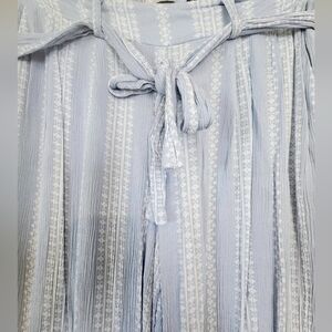 Light blue with floral white striped design wide-leg pants from Torrid. High-rise with a self-tie waist. Flowy, relaxed fit with vertical stripe detail. Easy to dress up or down.